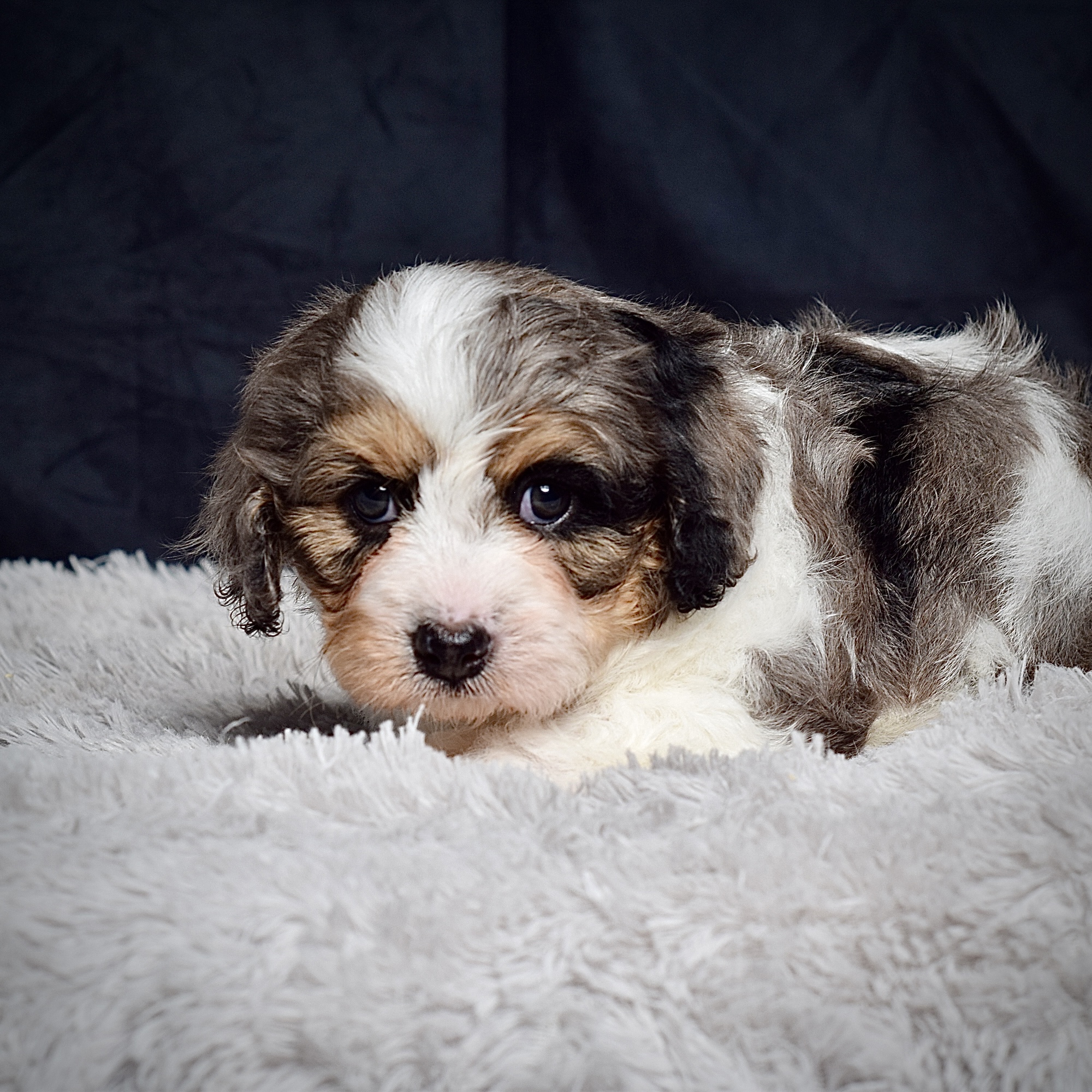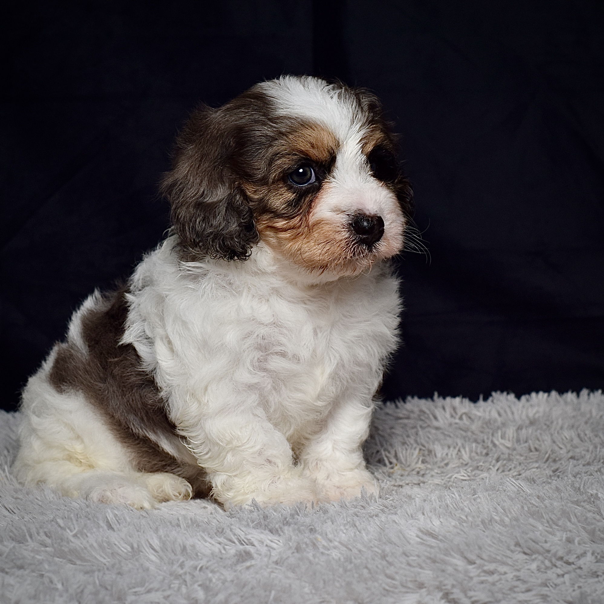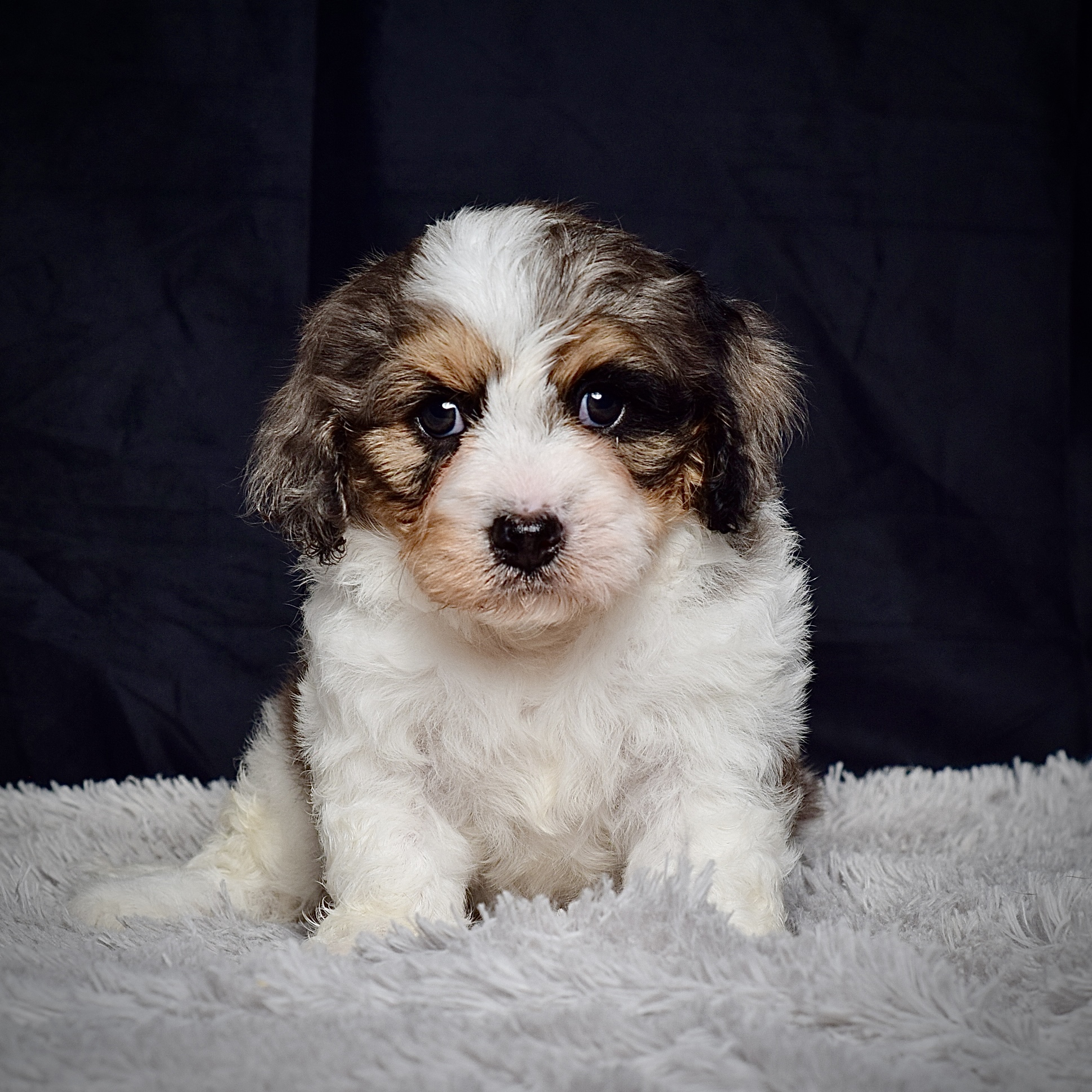 Meet this adorable petite mini cavapoo, a tiny bundle of joy with a delightful personality and a coat as soft as a cloud. He blends the intelligence and hypoallergenic traits of a Poodle with the friendly nature and loyalty of a Cavalier , all in a compact package. His playful spirit and heartwarming charm make him the perfect companion for any household, promising endless love and happiness to those lucky enough to bring him home.