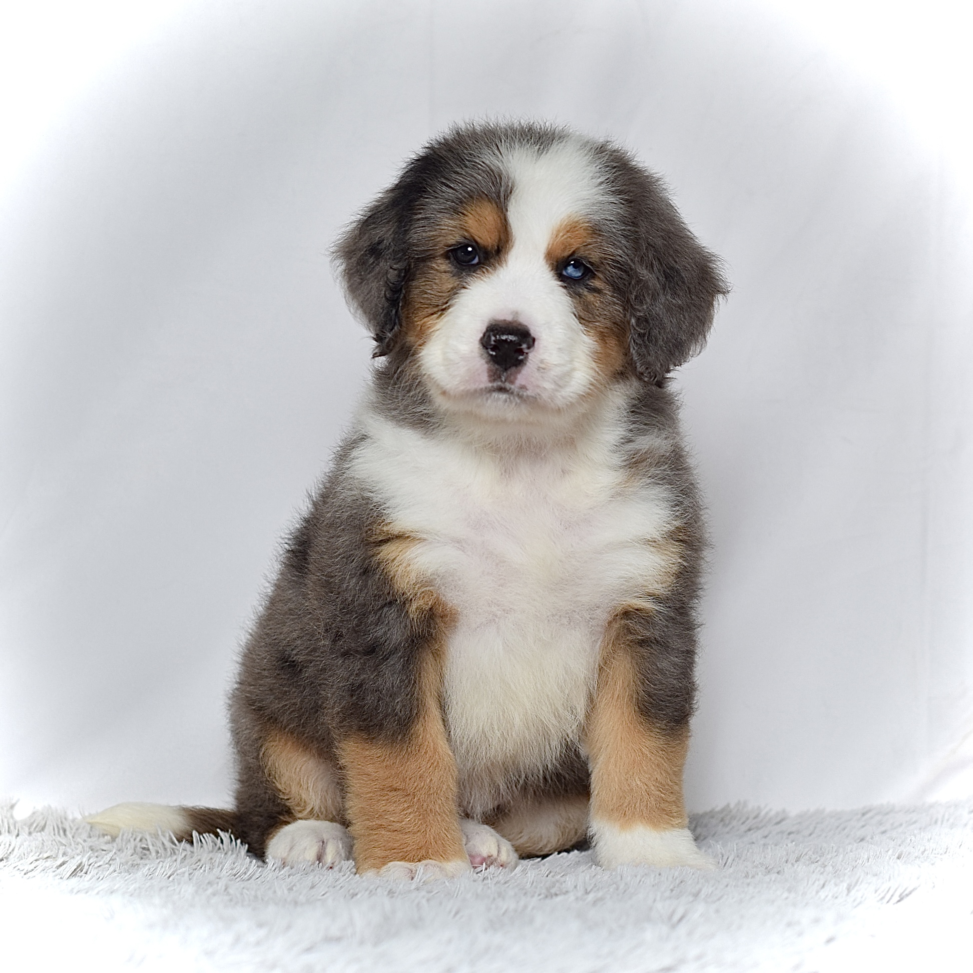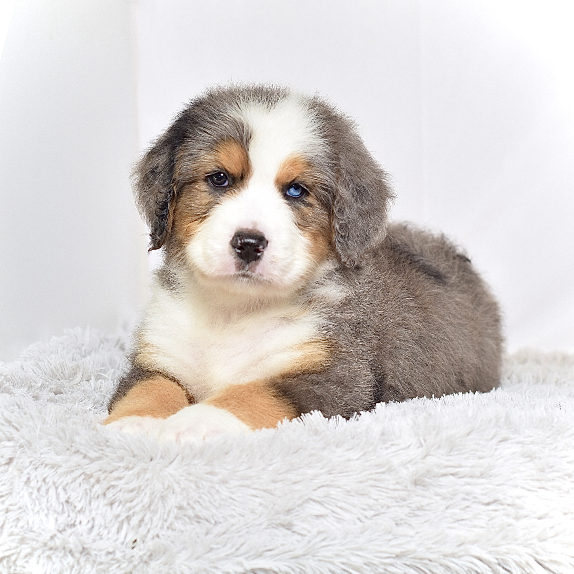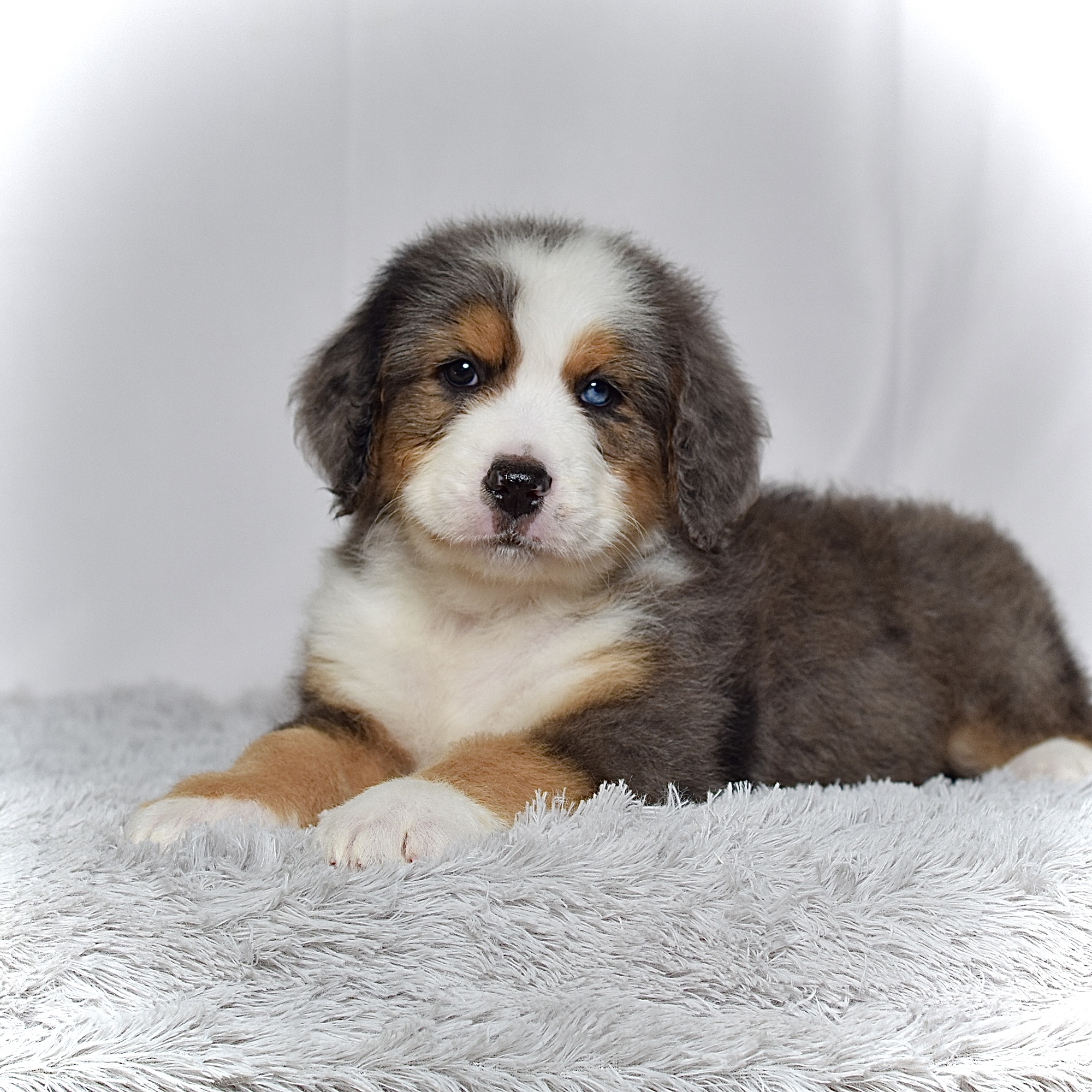 He is an absolutely gorgeous little fellow with a blue Merle tri colored coat.
