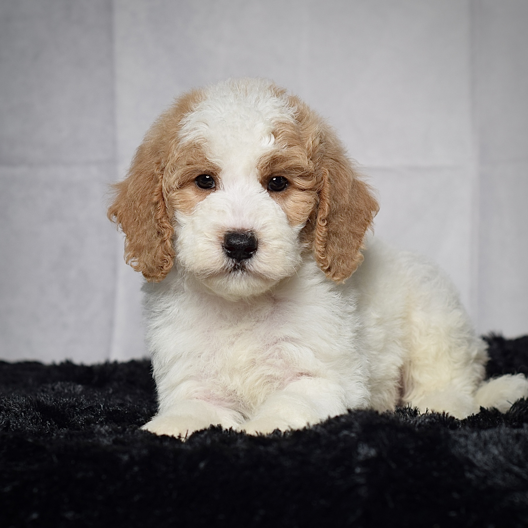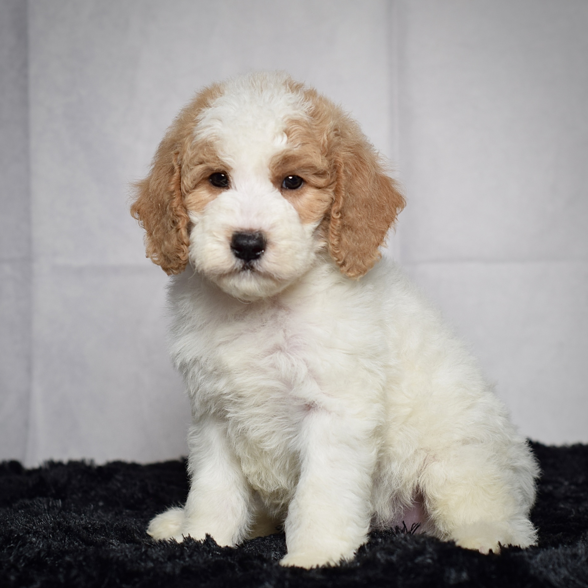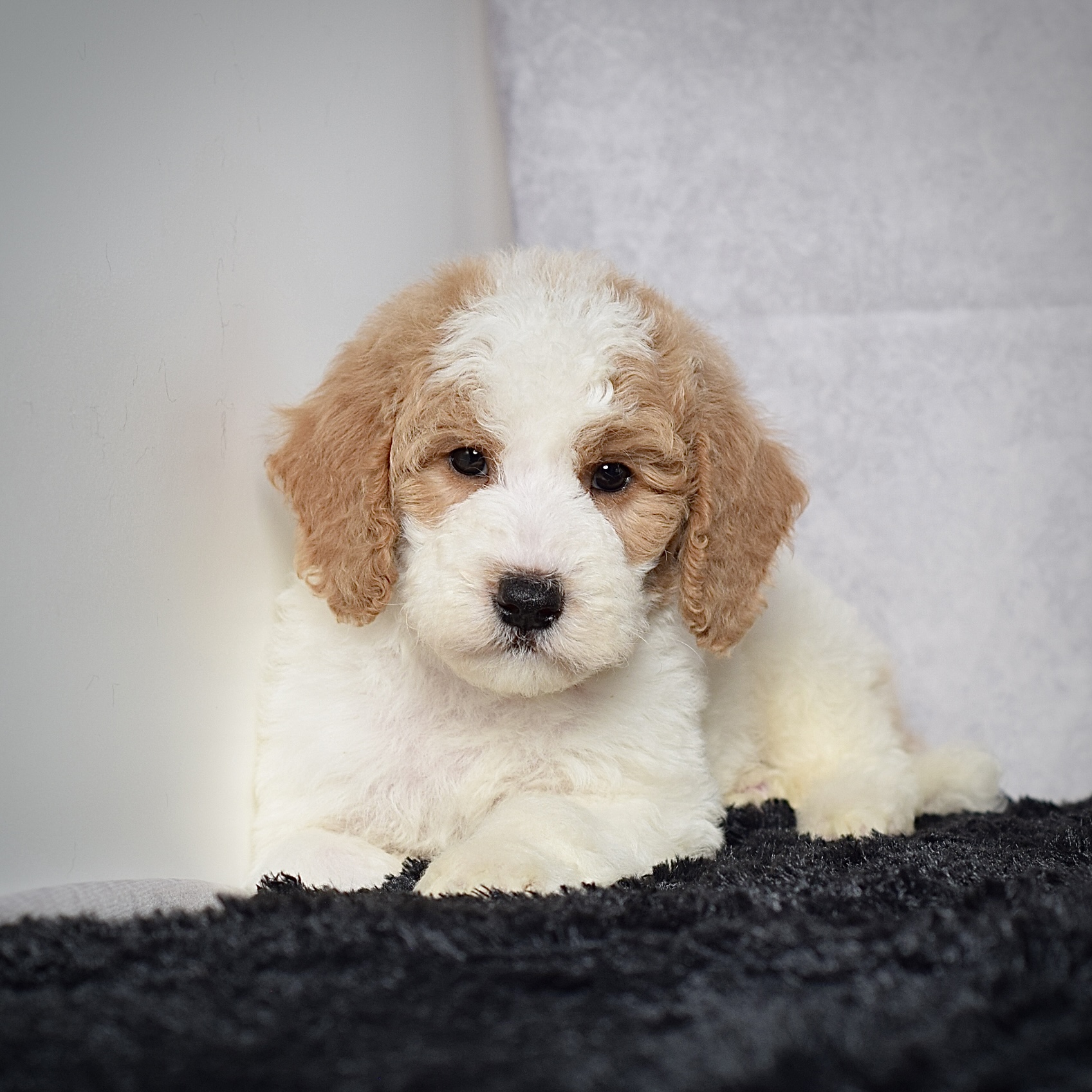 Meet this adorable mini Goldendoodle, a tiny bundle of joy with a delightful personality and a coat as soft as a cloud. He  blends the intelligence and hypoallergenic traits of a Poodle with the friendly nature and loyalty of a golden retriever, all in a compact package. His  playful spirit and heartwarming charm make him the perfect companion for any household, promising endless love and happiness to those lucky enough to bring him home.