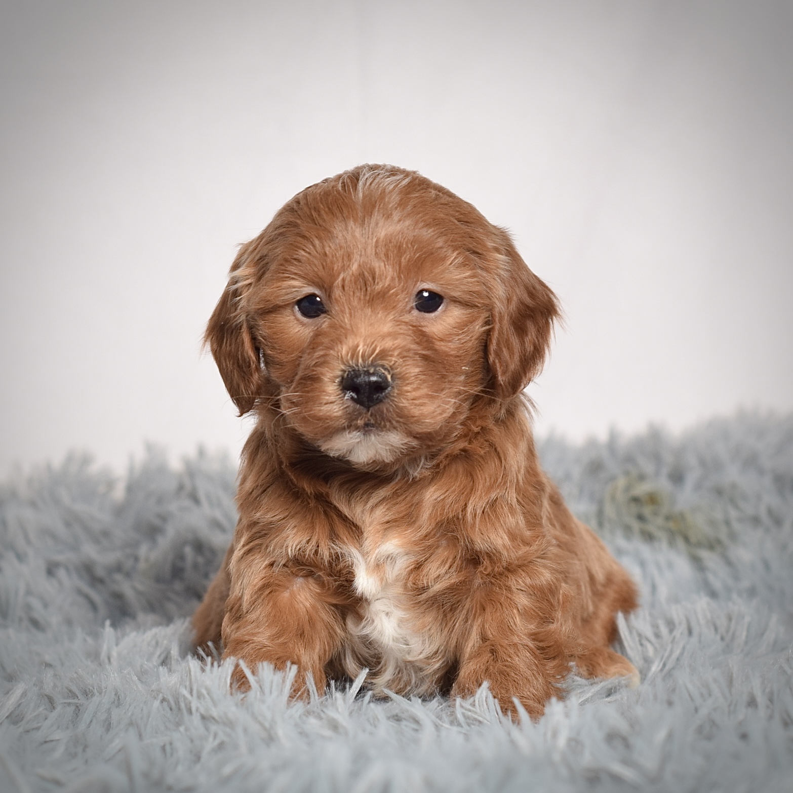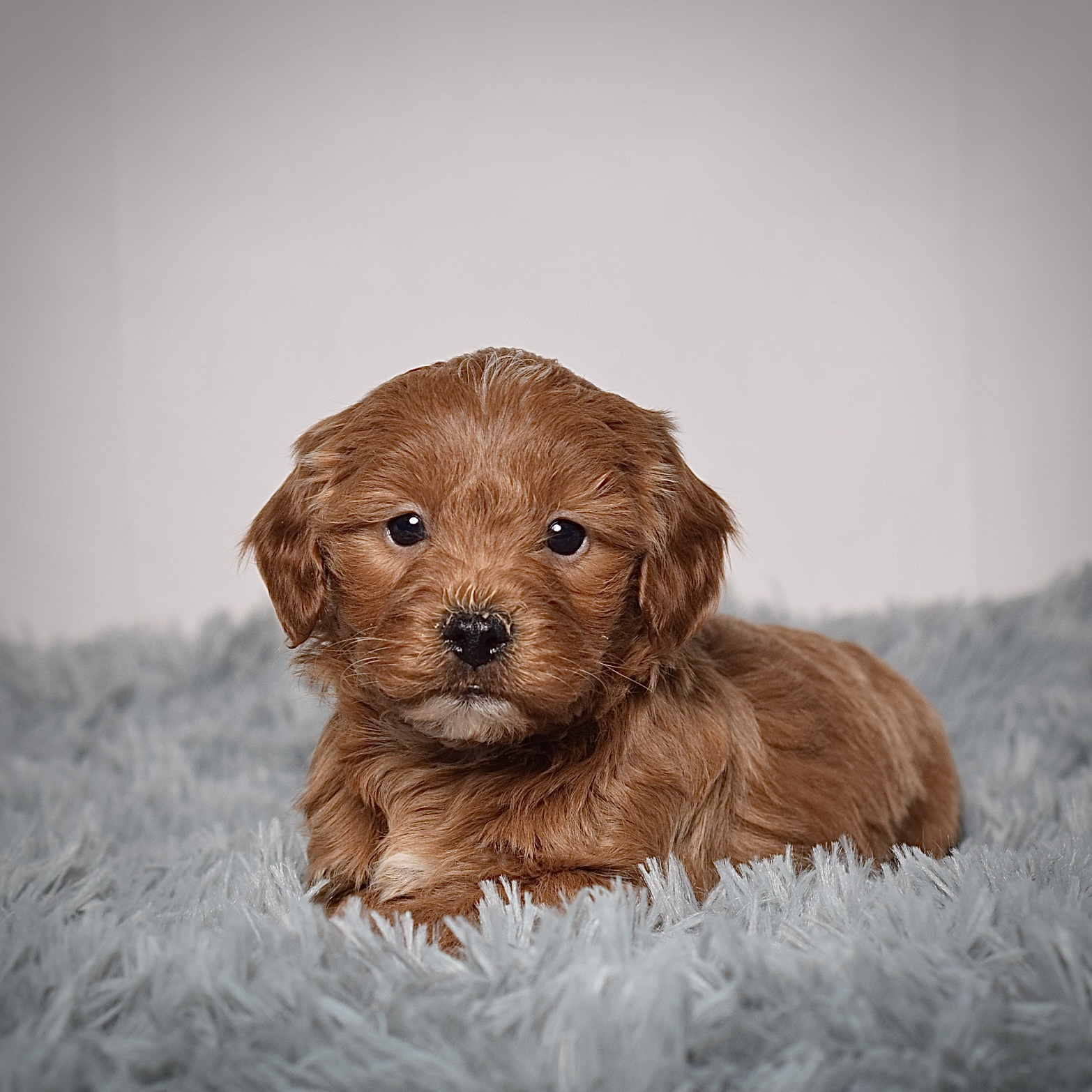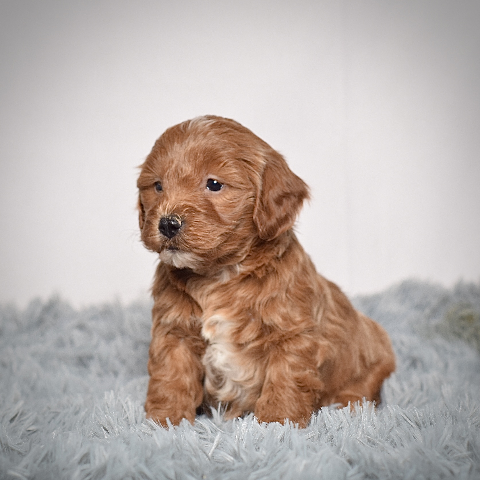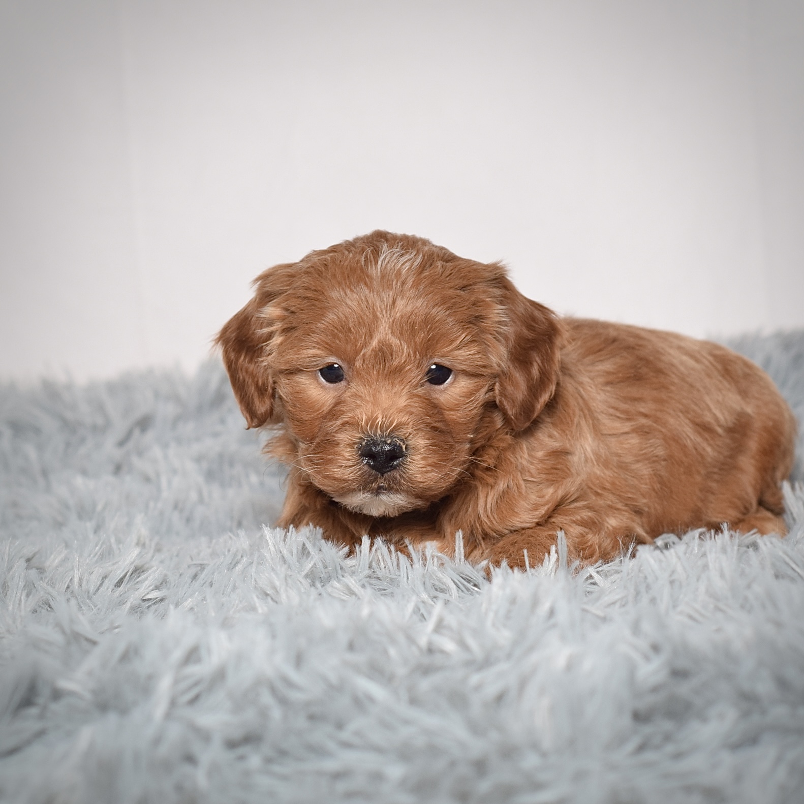 (Mom) Karla is a first generation Goldendoodle that weighs 25 pounds with a gorgeous red color and soft and fluffy coat. She is a wonderful mother and has a very sweet temperament.