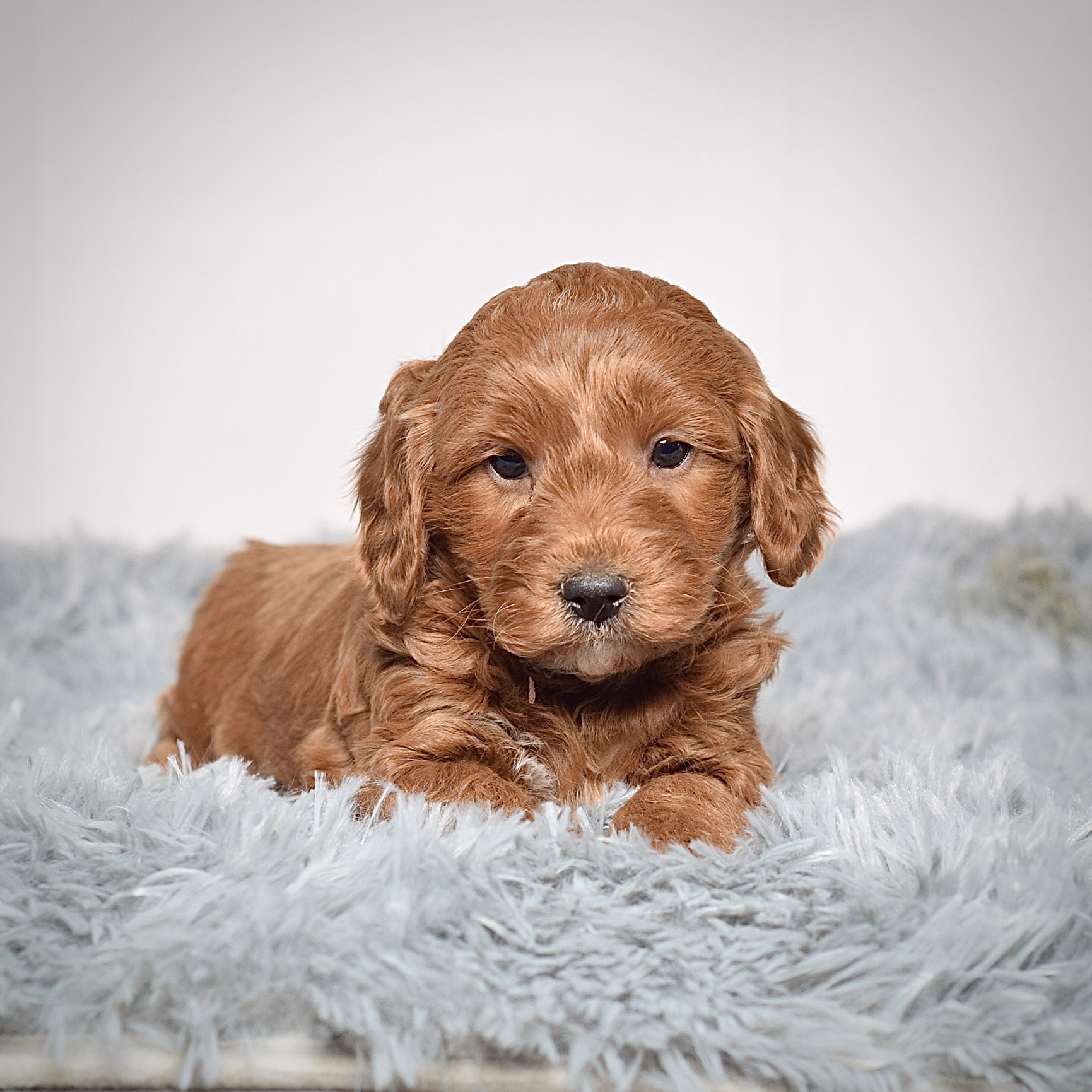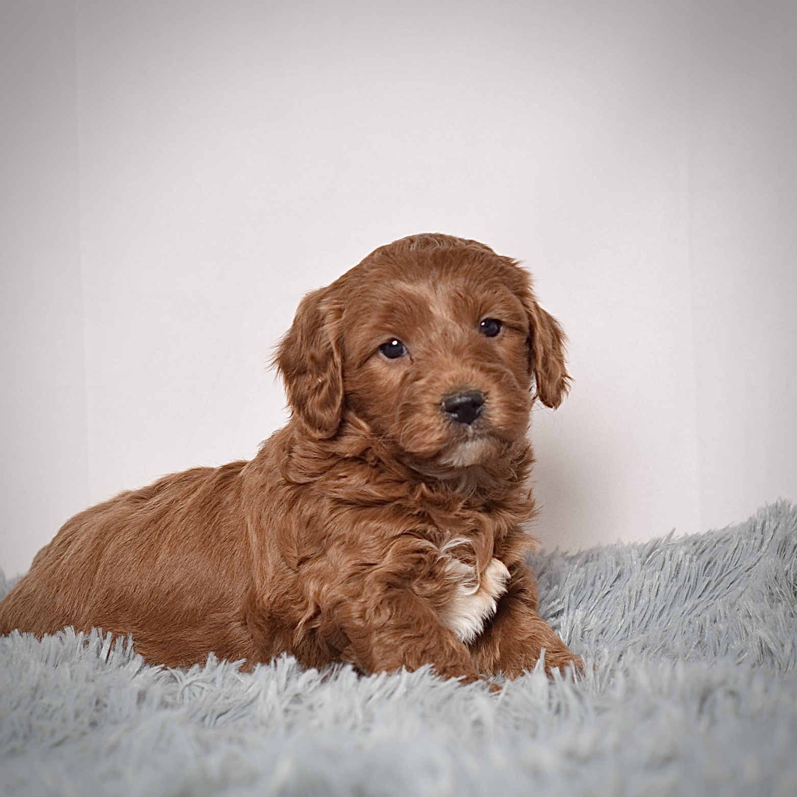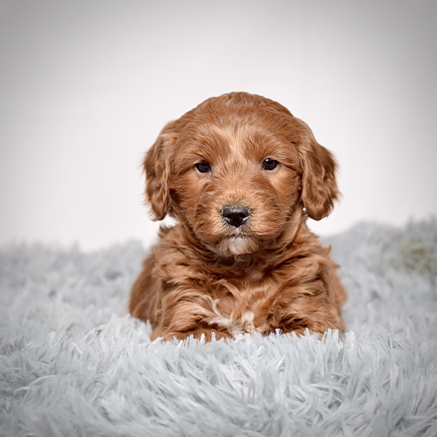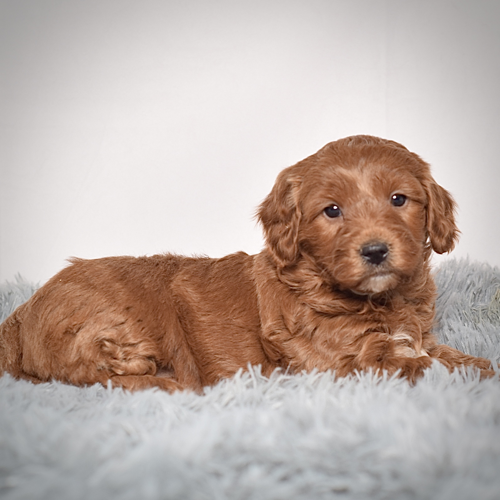 (Mom) Karla is a first generation Goldendoodle that weighs 25 pounds with a gorgeous red color and soft and fluffy coat. She is a wonderful mother and has a very sweet temperament.