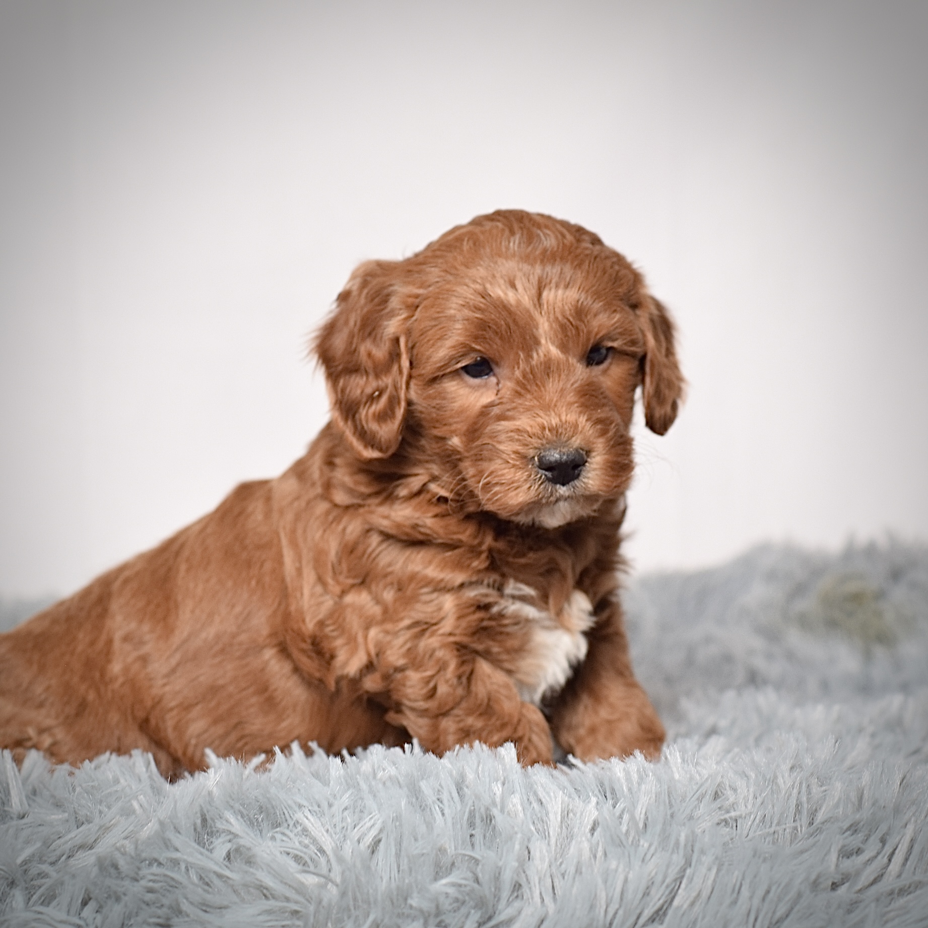 We are so excited to introduce you to our loving, playful F1b petite Goldendoodle puppies! All they know here at our family home is constant spoiling and love. Our children spend hours with them every day, romping around in the yard and giving them all the attention their little hearts could ever desire! Because of how socialized they are, they are perfectly friendly and well suited as companions for children of all ages. Tails wagging and paws bouncing, they have a way of wiggling into the hearts of everyone they meet. Their fun, contrasting colors are simply too cute to resist, along with those innocent, expressive puppy eyes looking into yours! They get their good looks from their parents