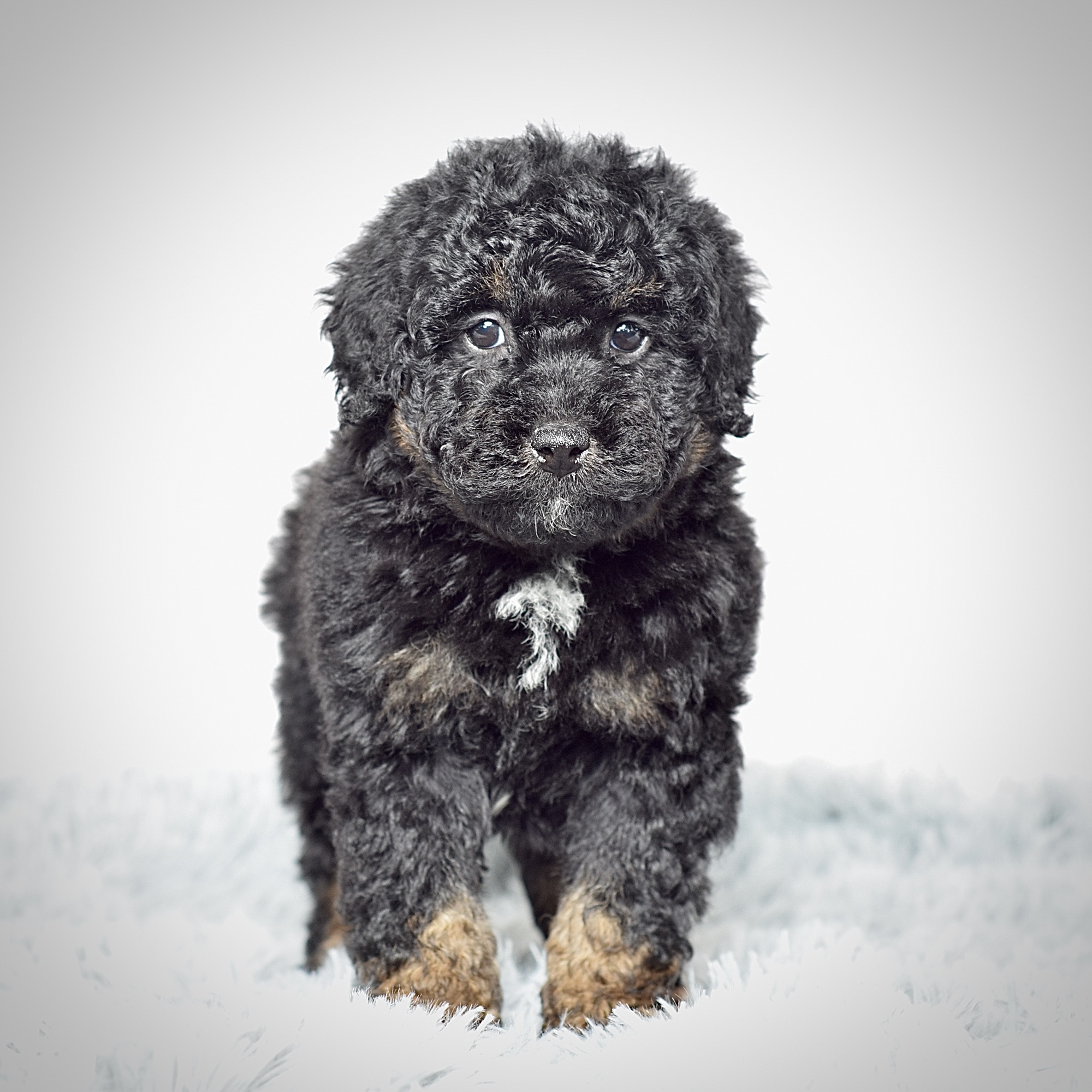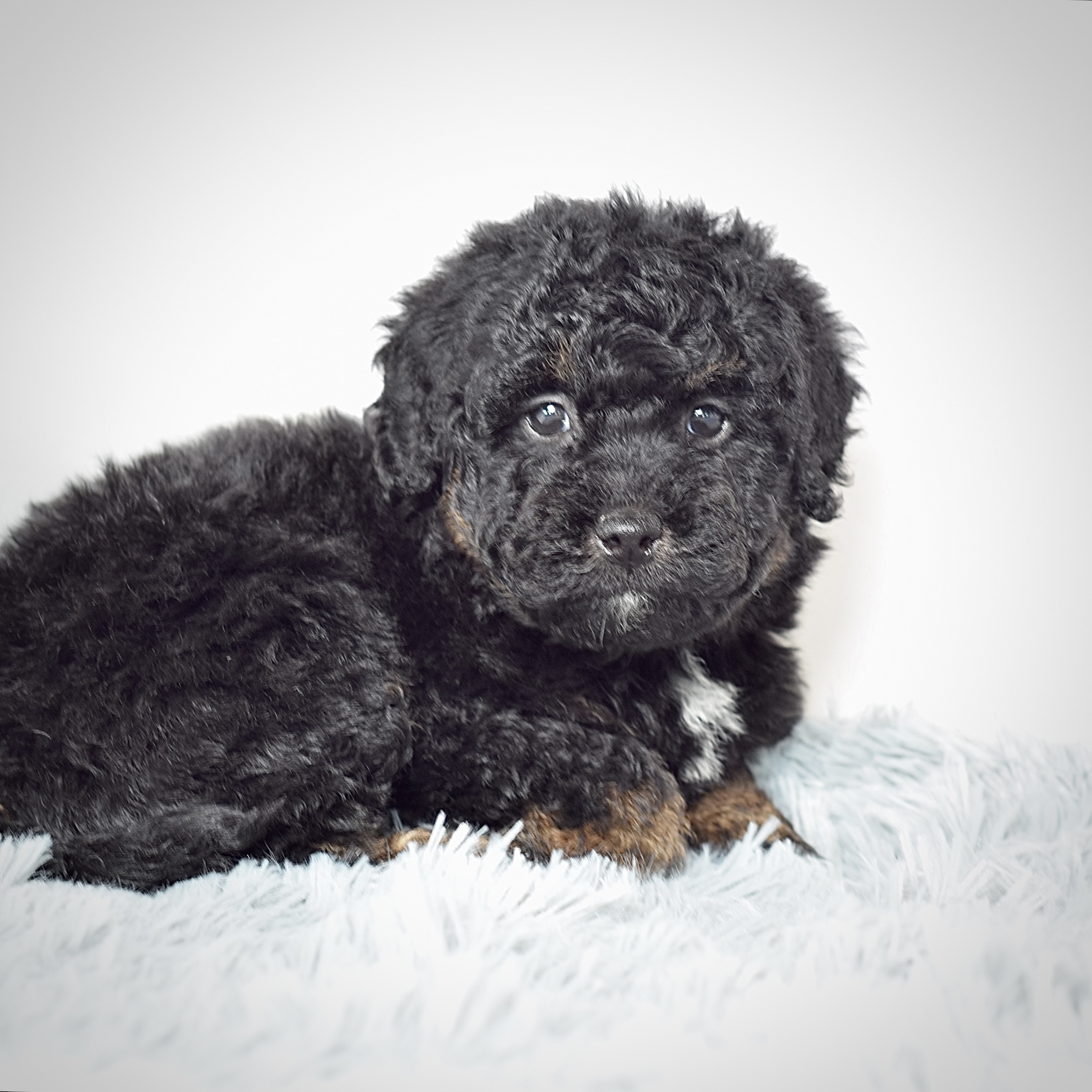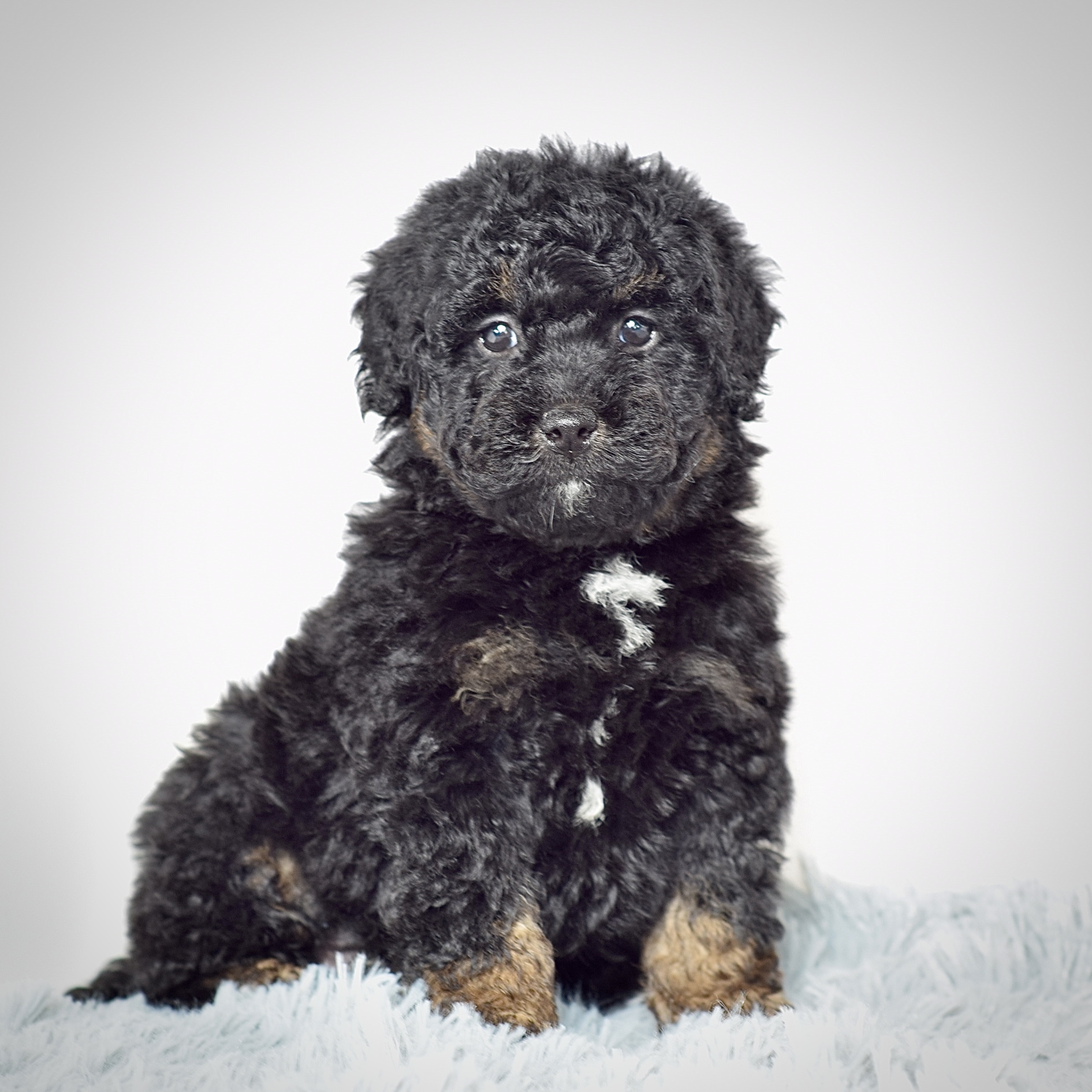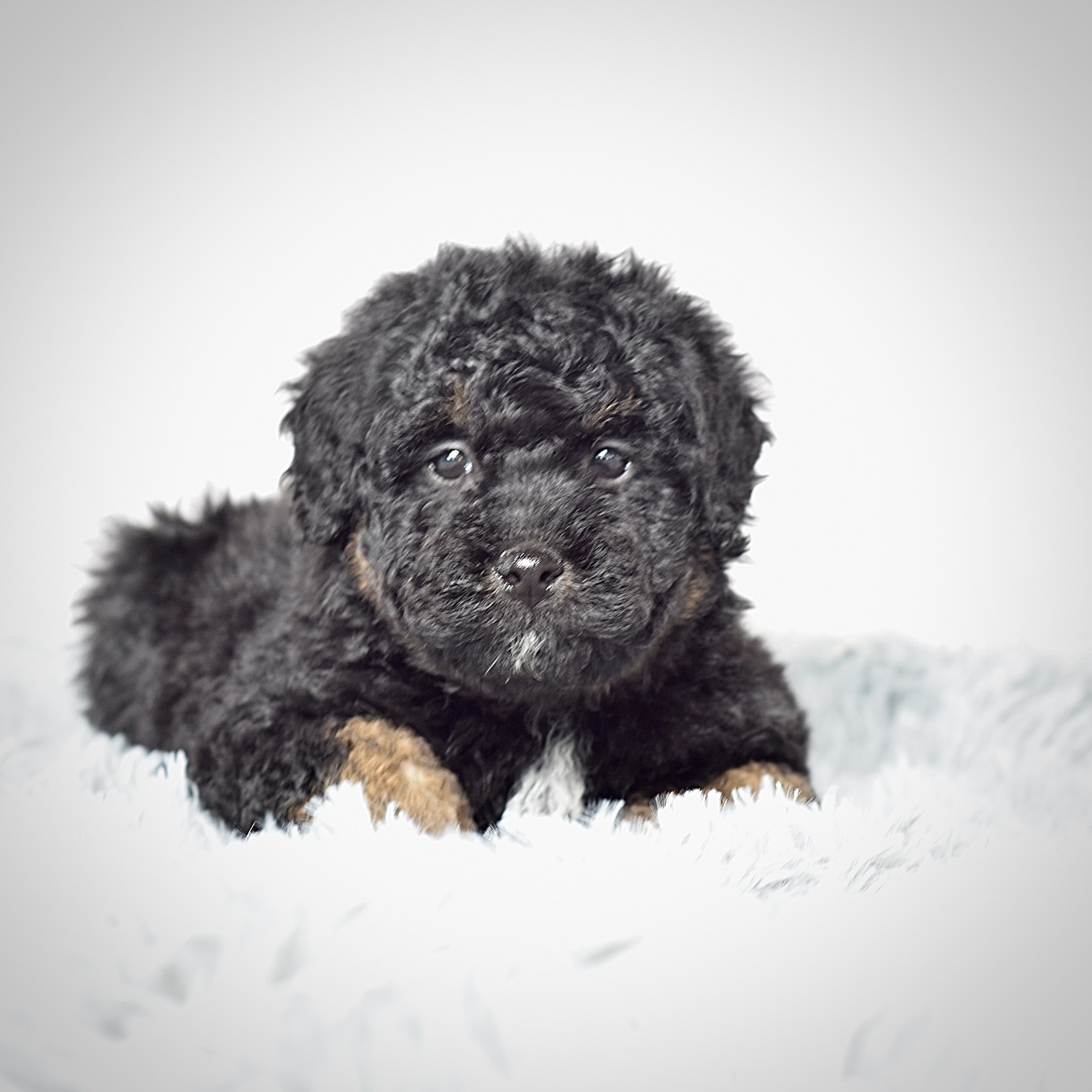 (Mom) Kenzi is a second generation Goldendoodle that weighs 15 pounds with a gorgeous black phantom color and soft and fluffy coat. She is a wonderful mother and has a very sweet temperament.