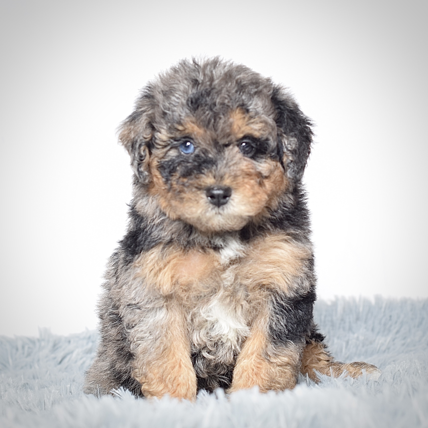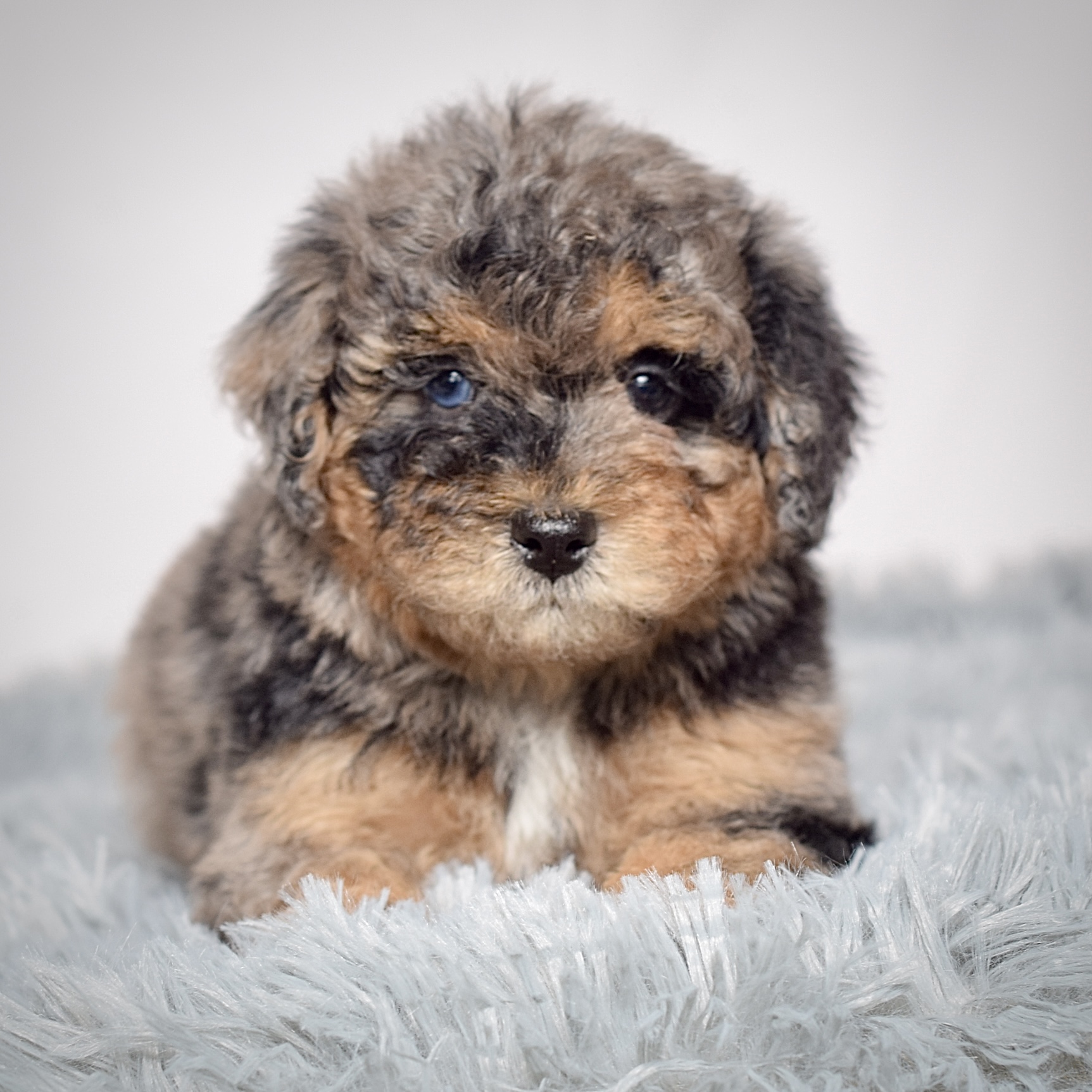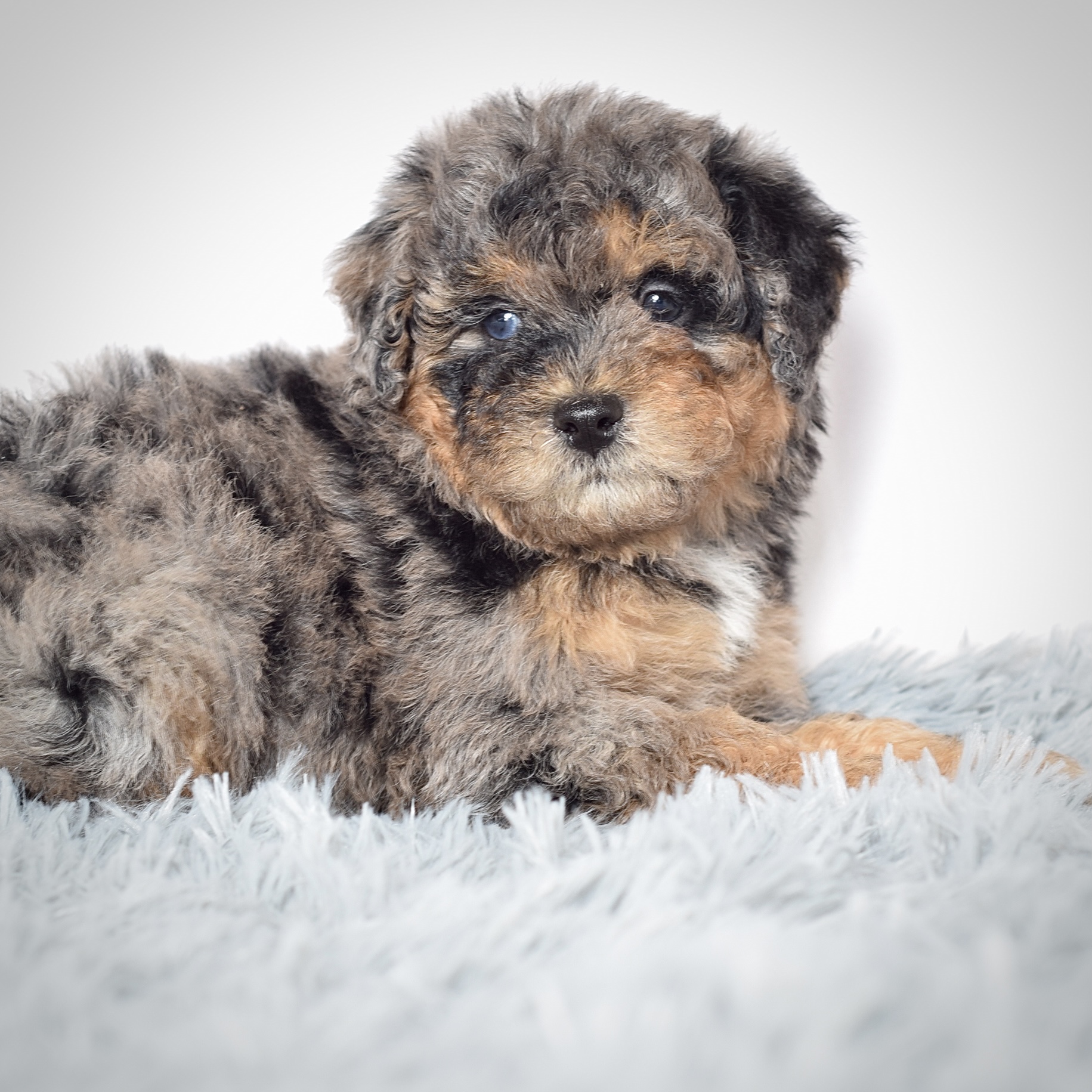 (Dad) Bennet is an AKC blue Merle parti colored poodle that weighs 11 pounds. He is Genetically tested and completely clear and healthy! He is very loyal and affectionate.