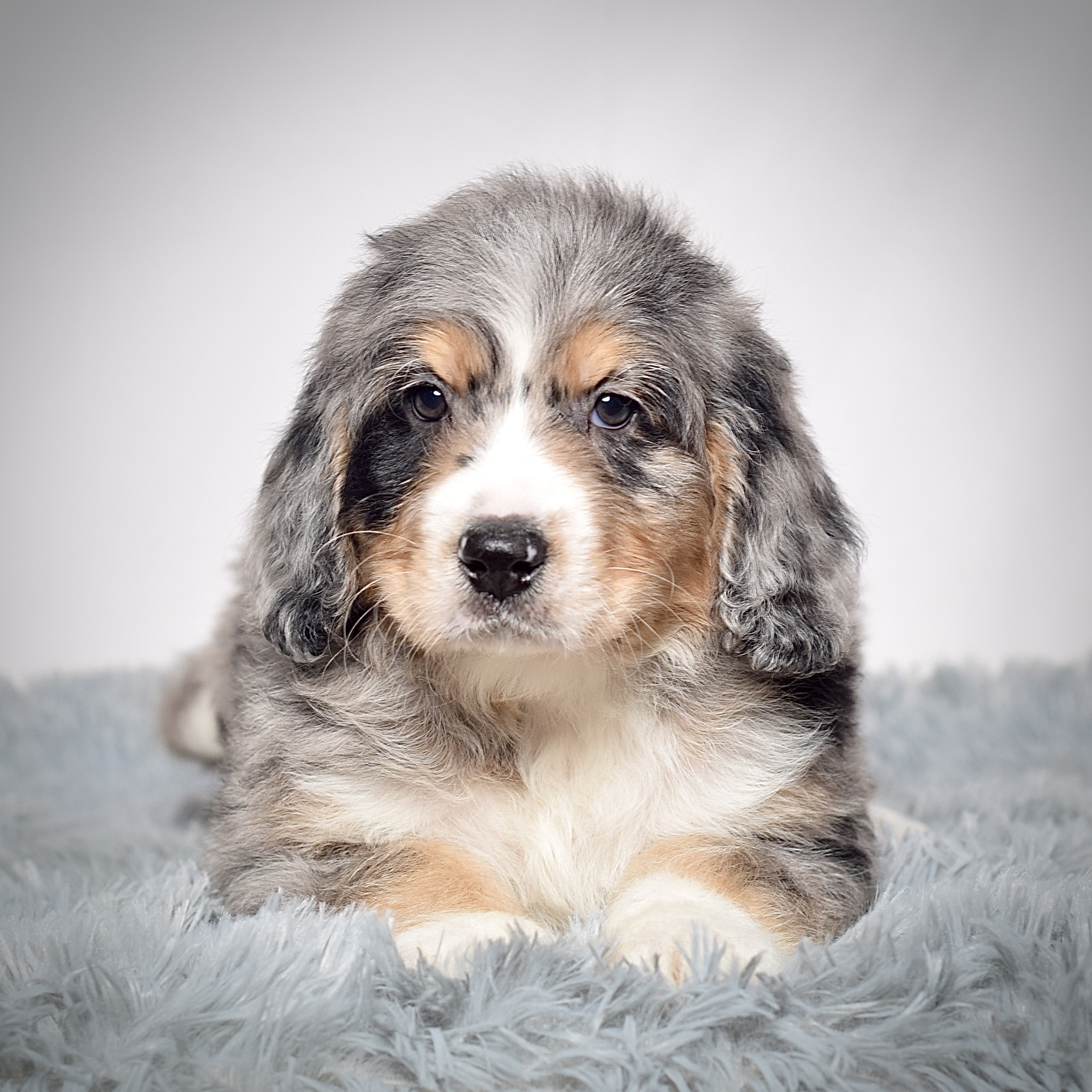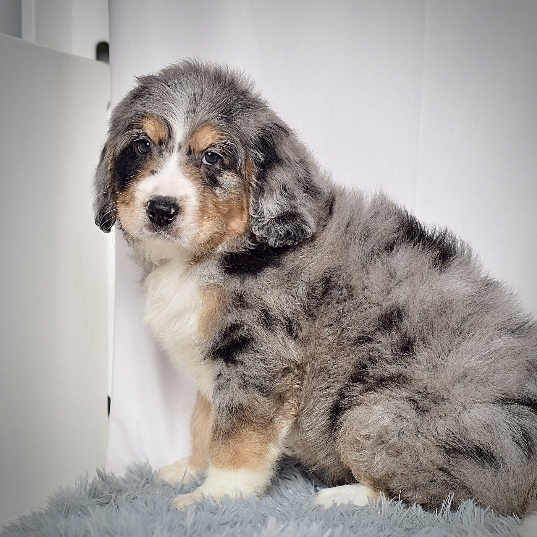 He is an absolutely gorgeous little fellow with a blue Merle tri colored coat.