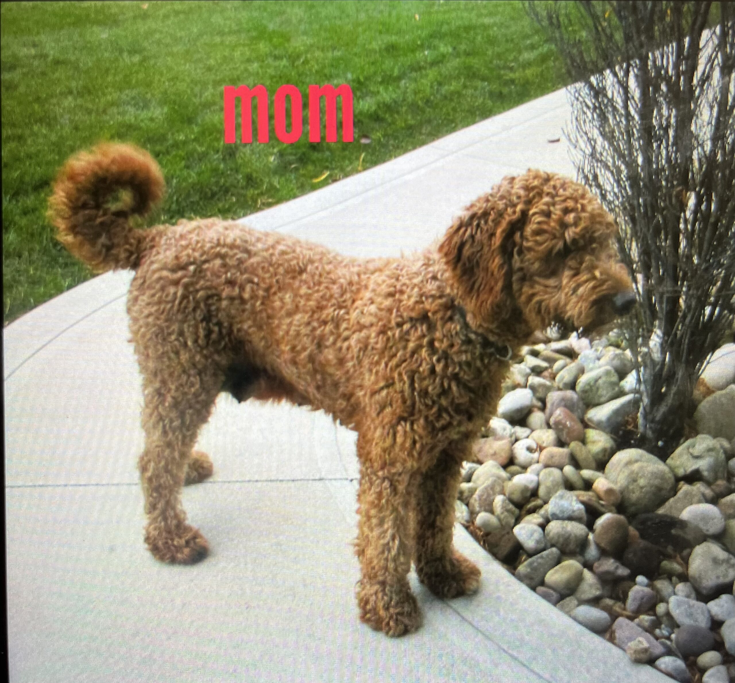 (Mom) Tracy is a 1st generation mini Goldendoodle that weighs 25 pounds with a soft and fluffy coat. She is a wonderful mother and has a very sweet temperament.