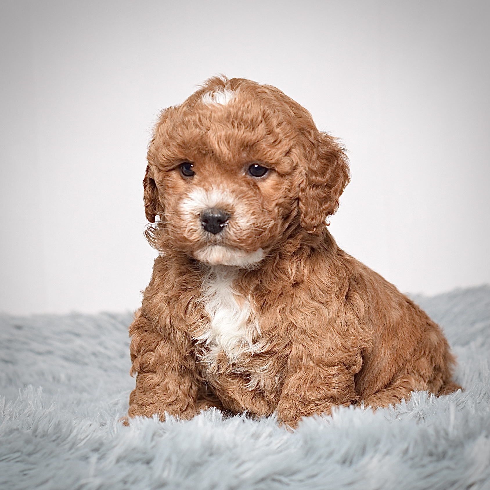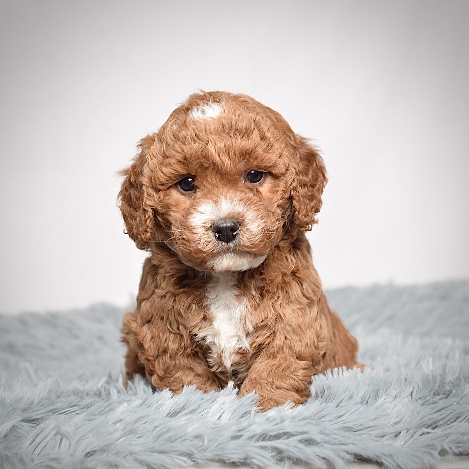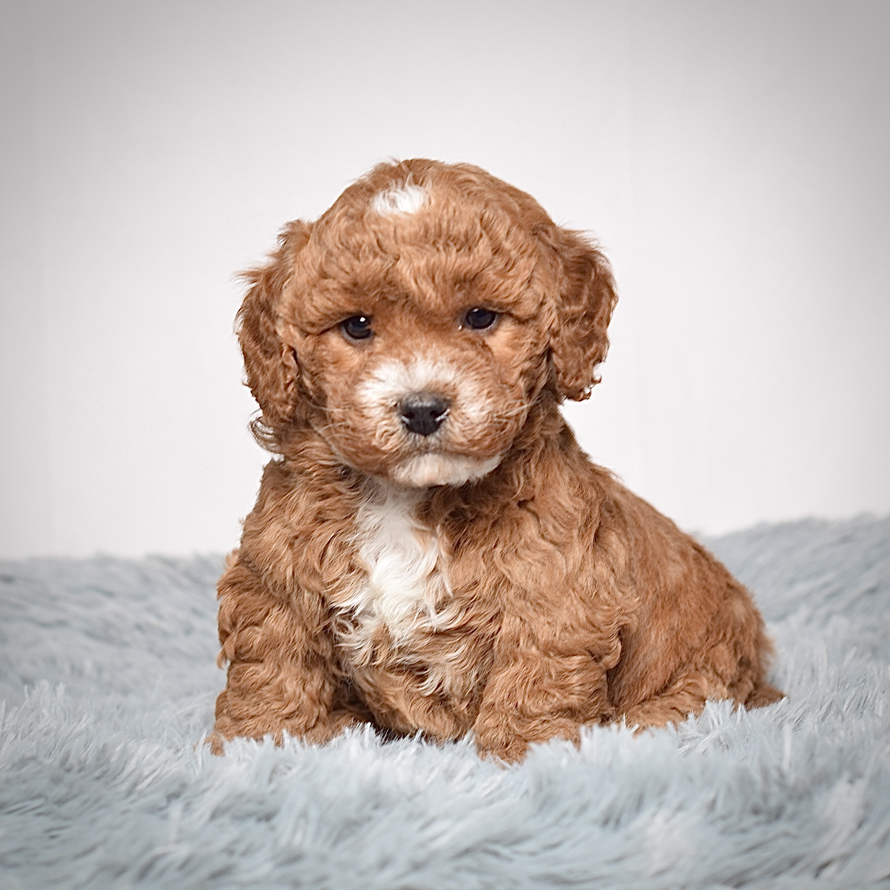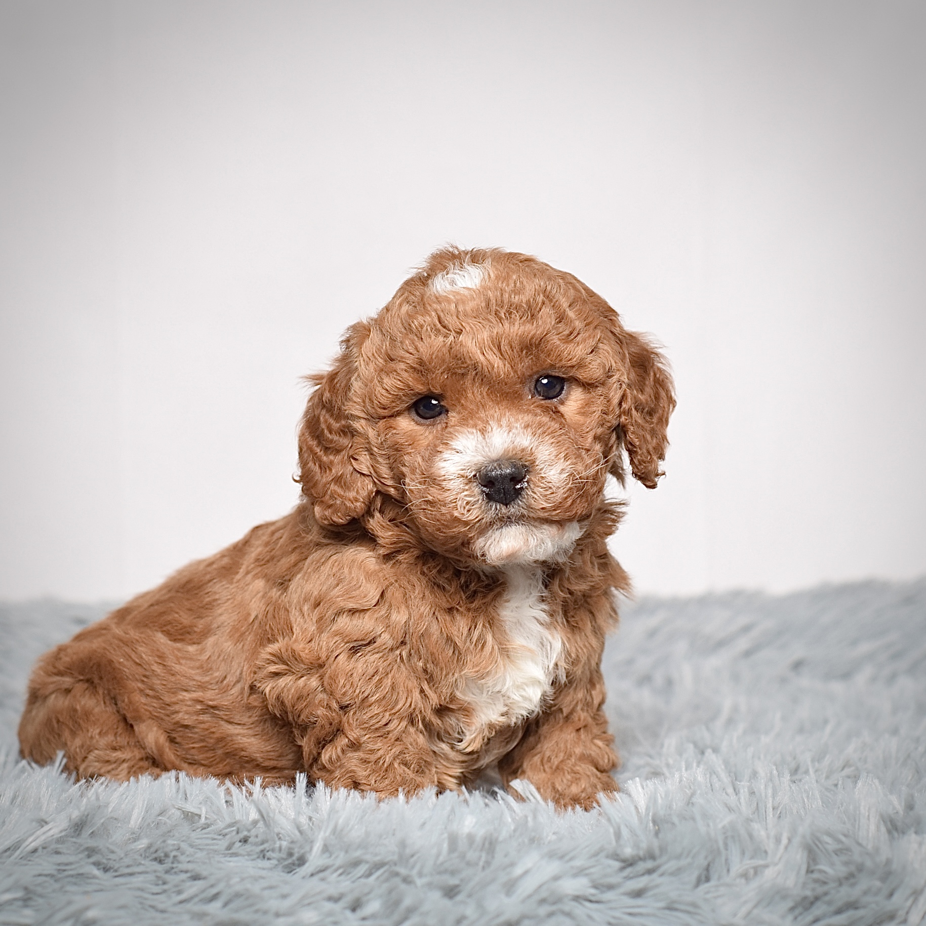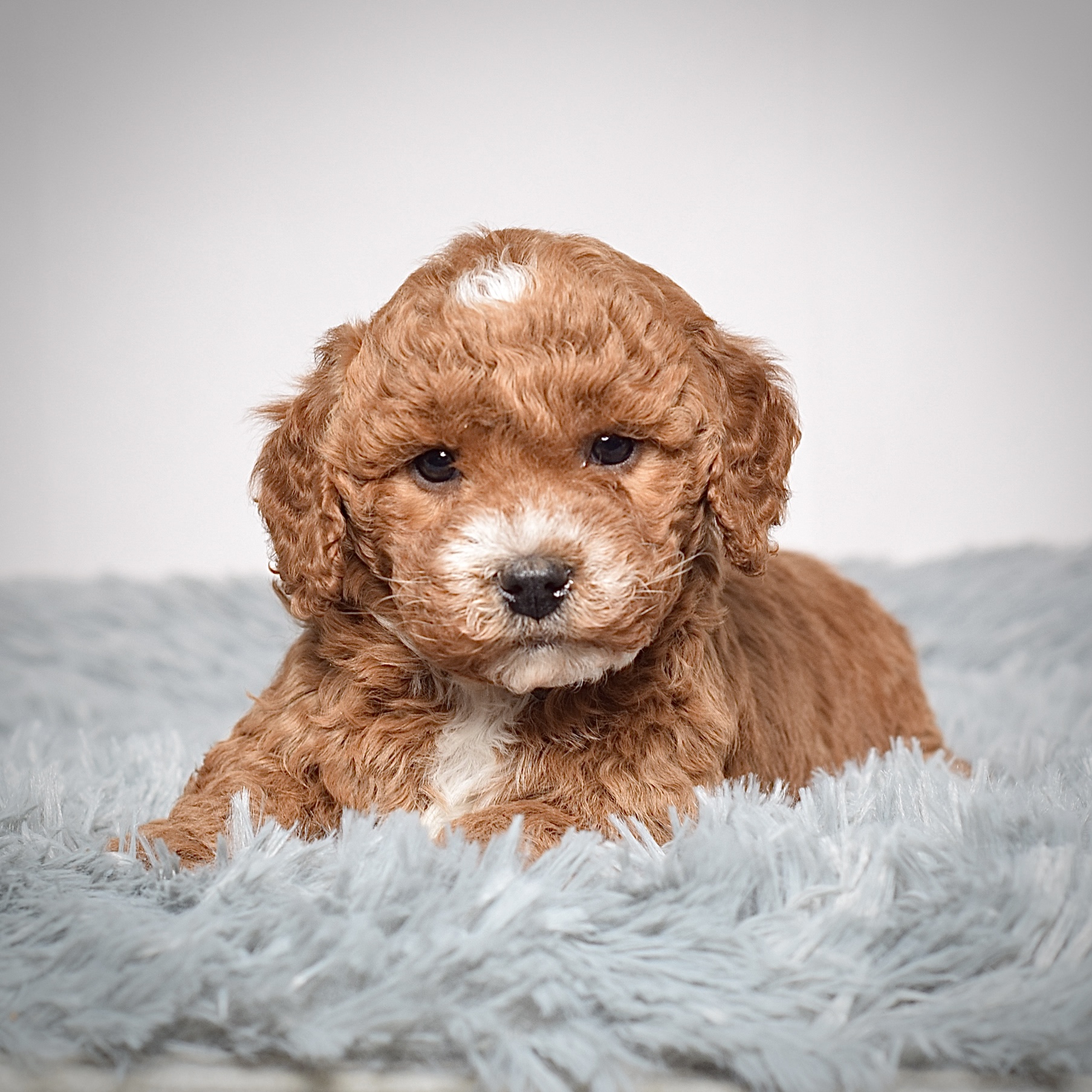 (Mom) Karla is a first generation Goldendoodle that weighs 25 pounds with a gorgeous red color and soft and fluffy coat. She is a wonderful mother and has a very sweet temperament.