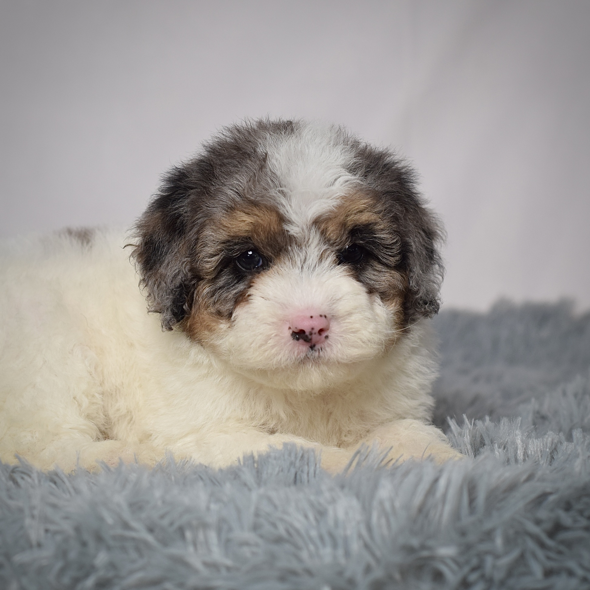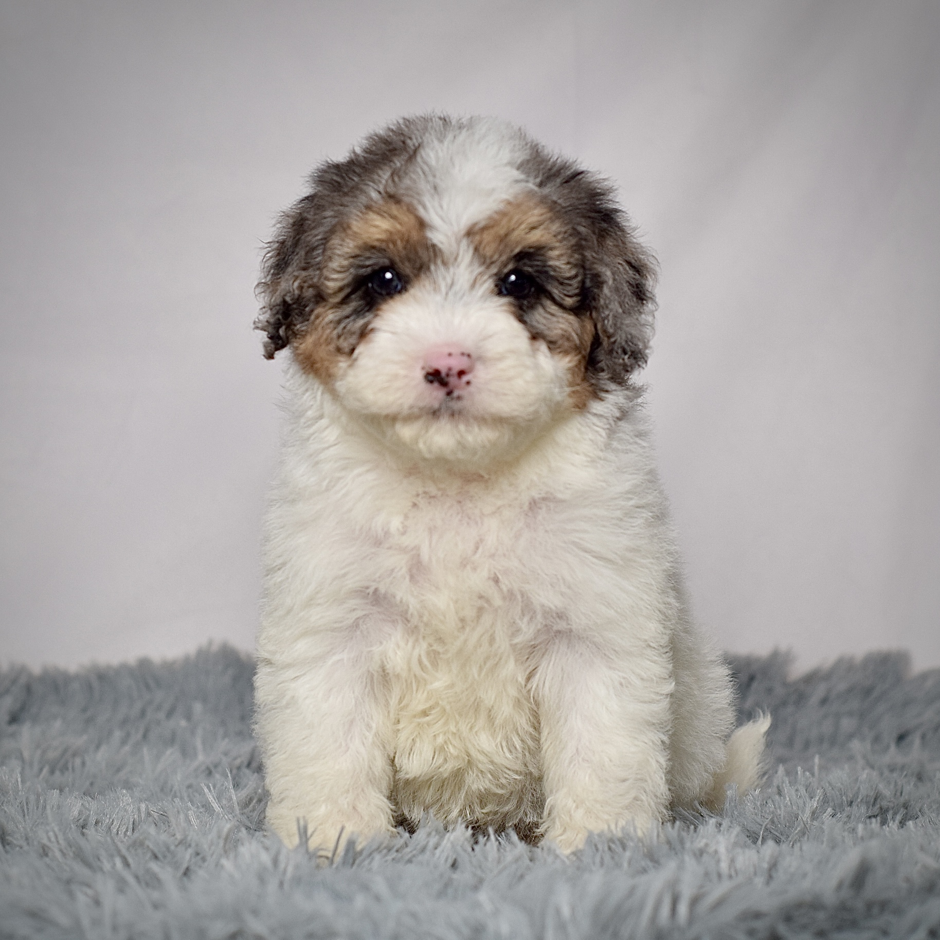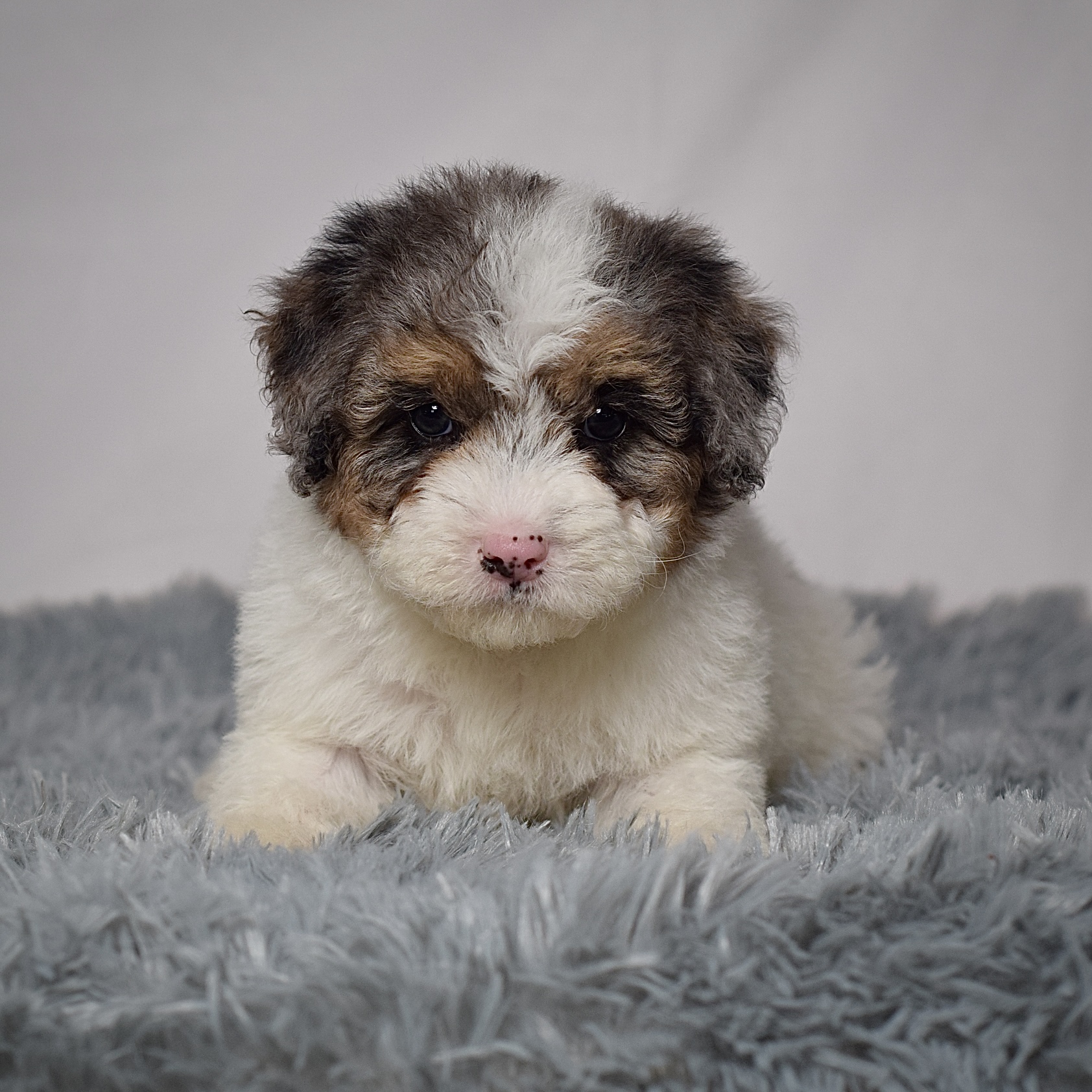 (Dad) Bennet is an AKC blue Merle parti colored poodle that weighs 11 pounds. He is Genetically tested and completely clear and healthy! He is very loyal and affectionate.